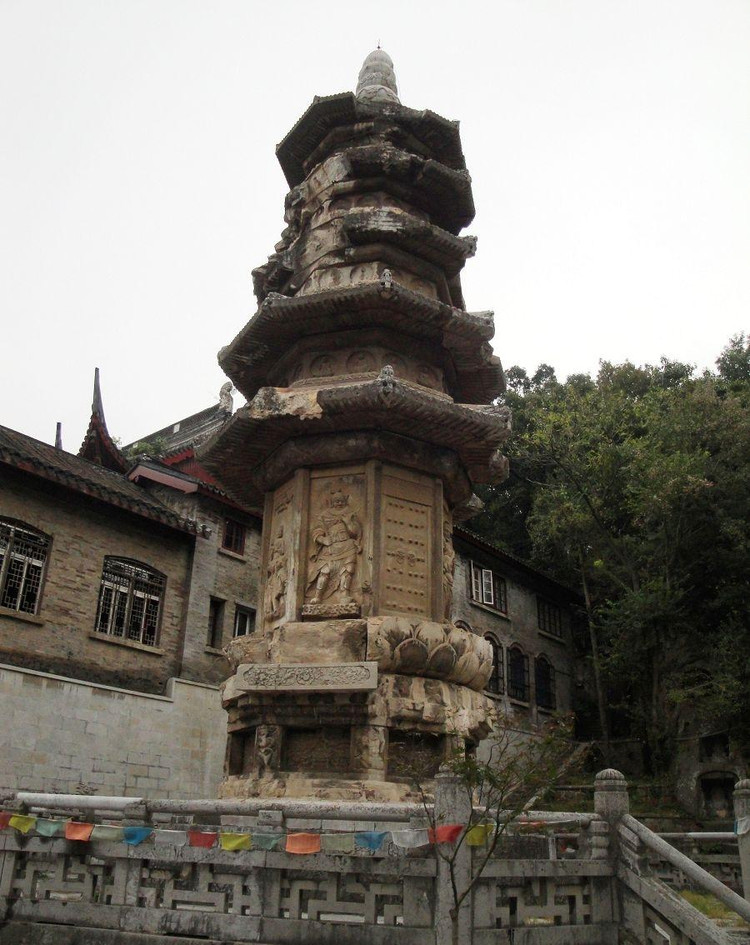 寺內(nèi)的另一勝跡是辟支塔,它挺立于千佛殿西北。此塔始建于宋代,塔高54米,是八角九層的樓閣式磚砌建筑。造型奇特,塔身上下不一。一至三層是重檐,四至九層為單檐。古樸的門窗、富有變化的塔檐和纖巧挺拔的塔身,使人感到莊嚴(yán)大方中不失玲瓏奇巧。