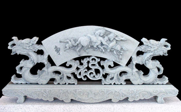即在石料表面雕刻半立體圖像。如建筑物裝飾于壁堵上的花鳥人物、山水風光,以及寺廟里的盤龍石柱等雕刻。根據雕刻程度的不同,又分為淺浮雕和高浮雕。淺浮雕為單層次的雕像,內容比較單一,沒有使用鏤空透刻手法。高浮雕是以多層次造像來反映比較繁復的內容,多采取透雕手法鏤空,更加引人入勝。浮雕是與建筑實用結合最密切的工藝,隨著紀念性建筑工程的增多,且更講究藝術裝飾美化,浮雕的使用也更廣泛,技藝也更精巧。