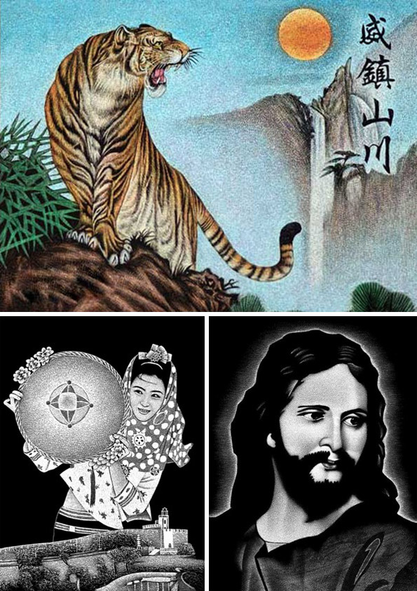 是在“針黑白”技藝上發展起來的新工藝,為惠安獨創。以表面磨光的本地產玉昌湖青石切鋸成平板作材料,利用此種石料琢鑿能顯示白點的特性,以各種型號的微雕鋼針,依照臨描于表面的圖像線條,邊對照照片邊細細琢鑿,靠著鉆點的大小、深淺、疏密的有機結合,區分黑白的不同層次,使圖像顯示出來。近年影雕工藝又有新的發展,出現了大版面的產品,目前影雕又擺脫黑白的局限,向彩色影雕發展。