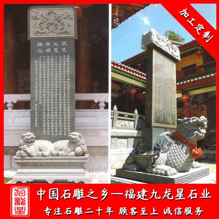 石雕龜馱碑是寺廟一種特別的石碑款式,因為比起簡單的石碑雕刻之外,紀念碑會加入一些特別的石雕藝術造型,比如龍龜,麒麟,貔貅,饕鬄,龍,鳳等神獸,加入這些元素可以展示一種神獸出世的視覺效果,也讓人覺得天降祥瑞的感覺。