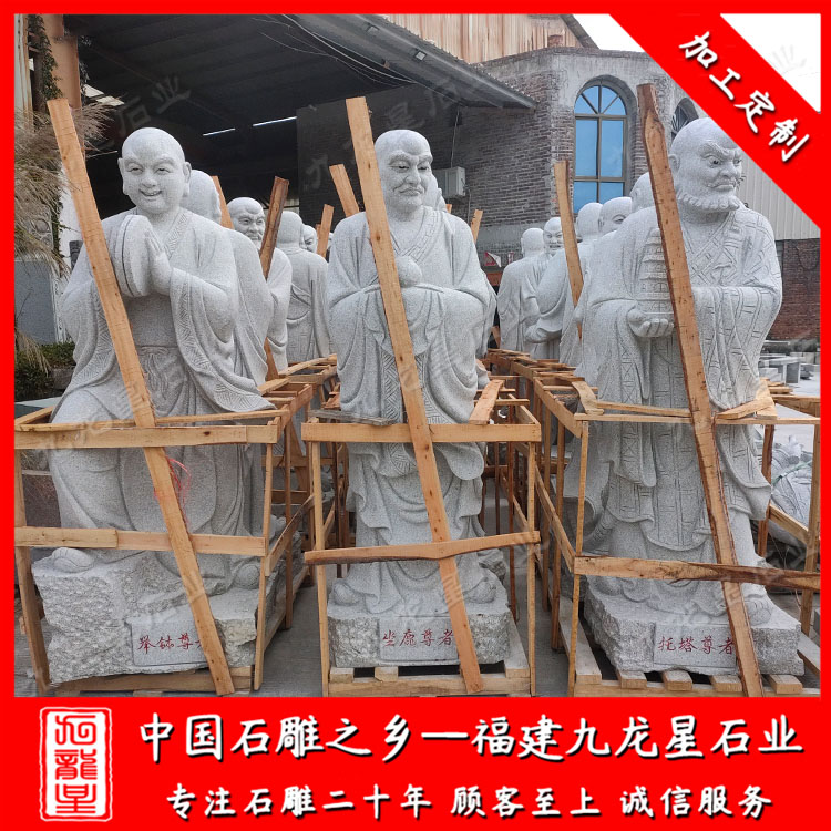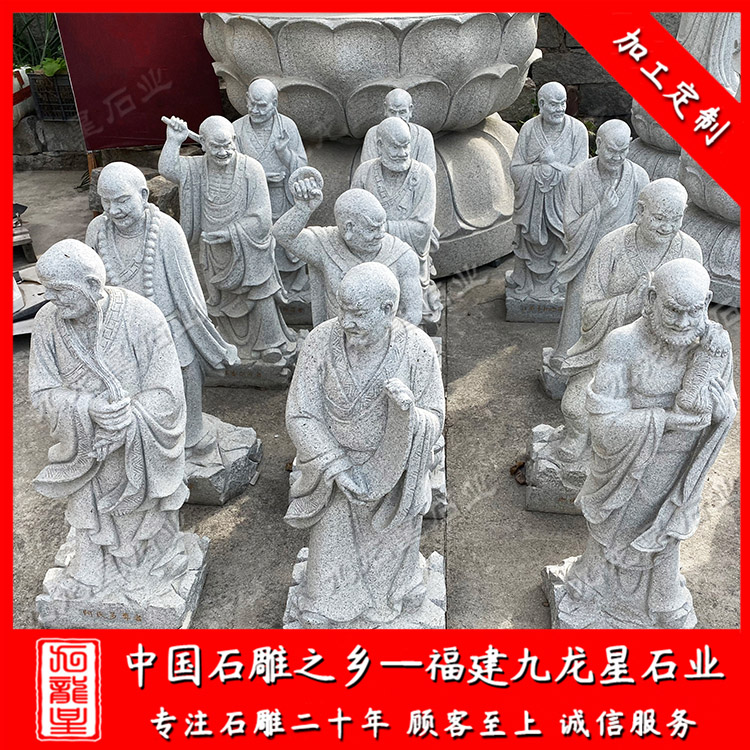 石雕十八羅漢廠家很多集中在福建惠安,福建九龍星石業(yè)發(fā)展有限公司位于--福建惠安,是十八羅漢石雕廠家,九龍星人相信每塊石頭都獨(dú)馥藝術(shù)氣息,所以善用千年文化雕鑿工藝的研究、傳承、融合和發(fā)揚(yáng),使石雕作品承載藝術(shù)文化、體現(xiàn)更多社會價值。九龍星從事石雕十八羅漢雕像加工制作20多年,石雕十八羅漢圖片全,寺廟石雕十八羅漢,大雄寶殿十八羅漢、景區(qū)石雕十八羅漢等都有。石雕十八羅漢材質(zhì)可以為花崗巖、青石、漢白玉等等,望廣大新老客戶前來參觀考察和選購。