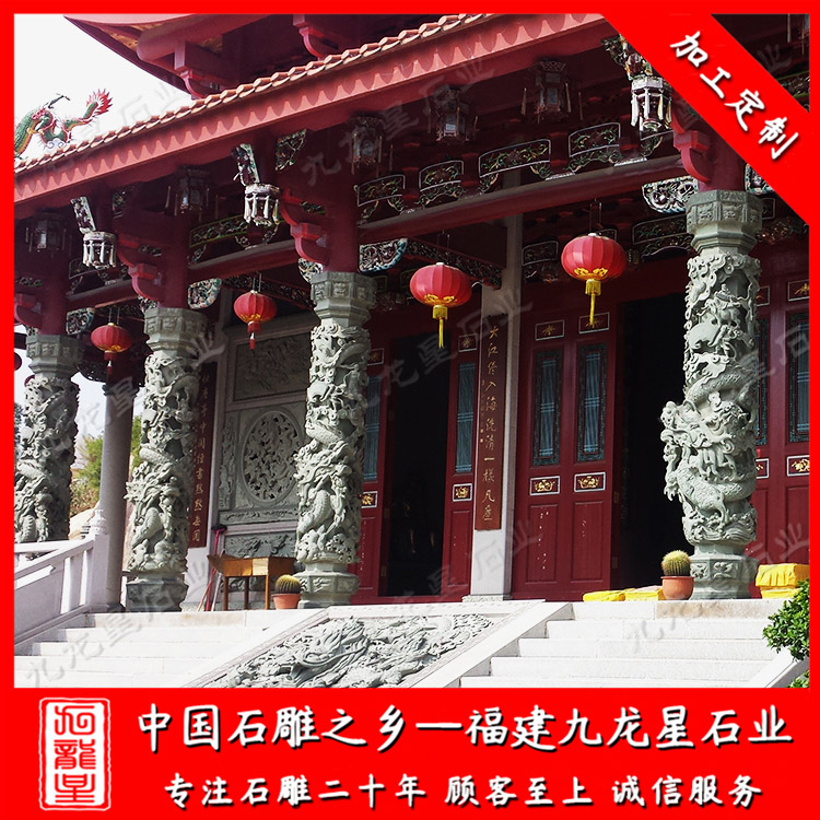 石雕龍柱有文化象征意義,是與傳說中龍在天則騰云駕霧、下海則追波逐浪、在人間則呼風喚雨的無比神通有很大的關系。而龍柱在生活中的應用也是很多,特別是在寺廟祠堂這種地方,一般都是需要龍柱作為大殿前 的頂梁柱。石雕龍柱是寺廟祠堂常用的石雕柱子,一般都是以青石石材為主,祠堂是一種比較嚴肅的地方,青石就是一種古香古色穩重的感覺,用于祖廟祠堂石比較合適的。我們稱之為寺廟青石龍柱、祠堂石雕龍柱。