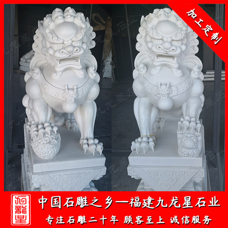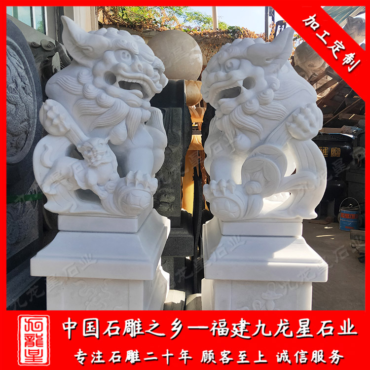 別墅庭院門口石獅子一般采用的是漢白玉石材,漢白玉從字面上我們可以看出顏色為白色。漢白玉門口石獅子干凈潔白。別墅庭院門口石獅子除了保佑家宅平安等吉祥的寓意之外,還起著裝飾別墅庭院門口的作用。