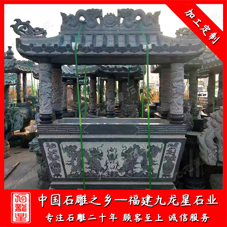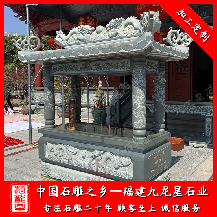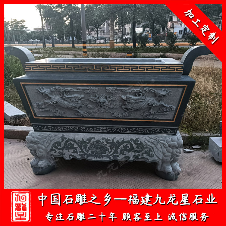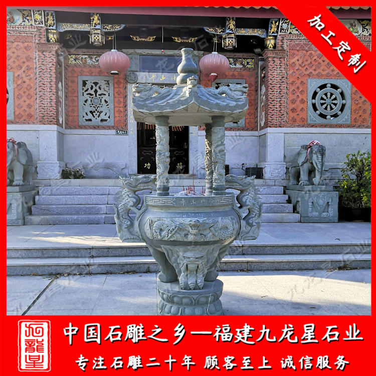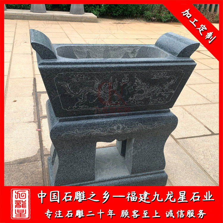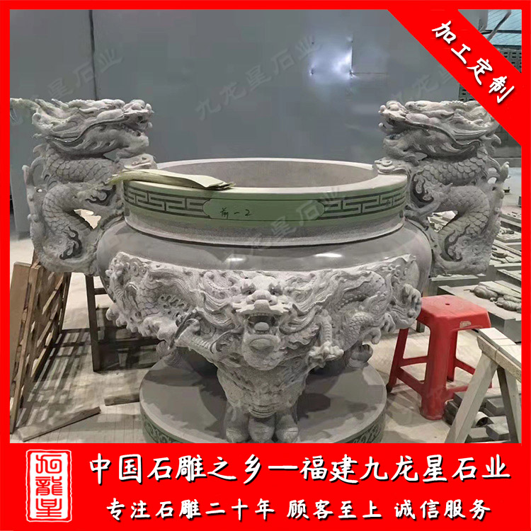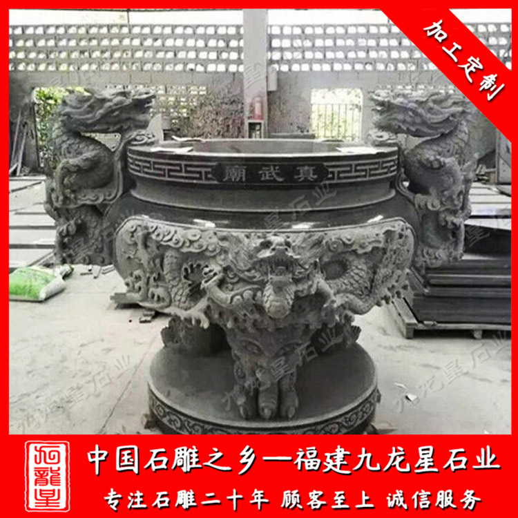 其二,大型石雕香爐所采用的材質也是影響報價的因素。常見的大型石雕香爐材質為青石、花崗巖。同等材質的情況下青石大型石雕香爐報價或高于花崗巖石雕香爐報價。