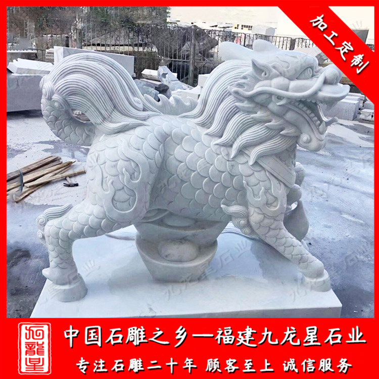 其三,石雕麒麟加工常用的材質還有漢白玉。在經濟條件充裕的情況下,也有很多人會選用漢白玉來加工石雕麒麟。漢白玉材質表面潔白,讓加工好的漢白玉石雕麒麟更為精致細膩。