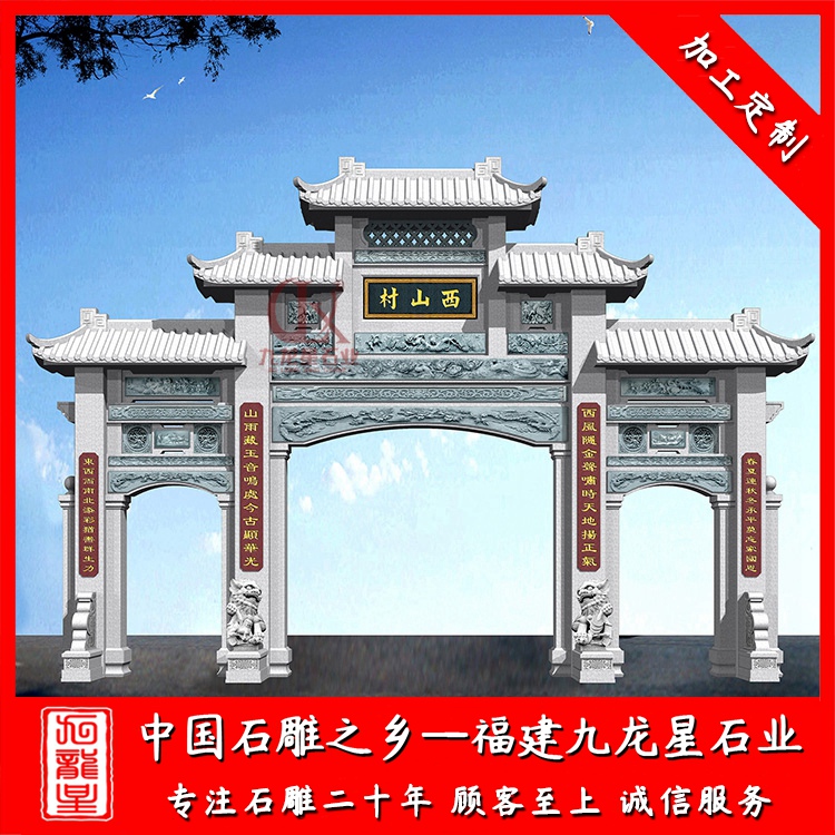 常見的新農(nóng)村石牌坊樣式有三門新農(nóng)村石牌坊。其中新農(nóng)村三門石牌坊中又可以細(xì)分為三門三樓新農(nóng)村石牌坊、三門五樓新農(nóng)村石牌坊樣式等等。三門樣式的新農(nóng)村石牌坊很是受村民們的喜愛,在新農(nóng)村的村口處很常見。