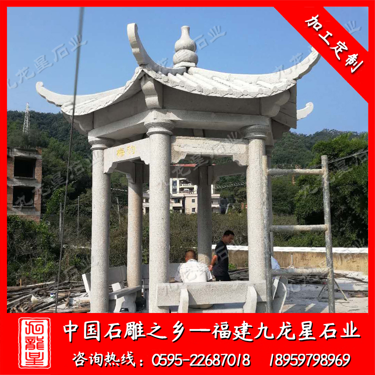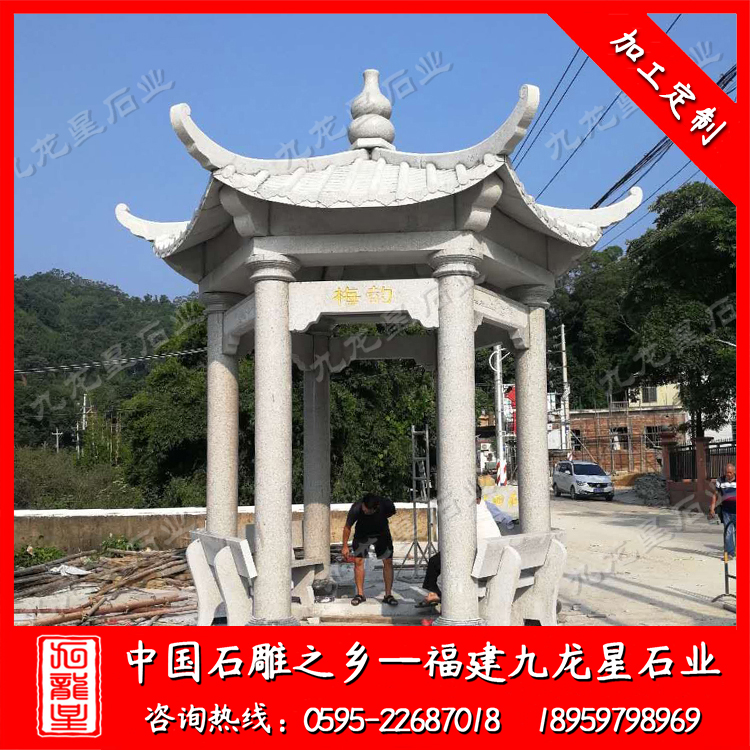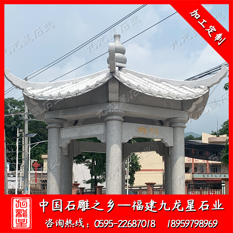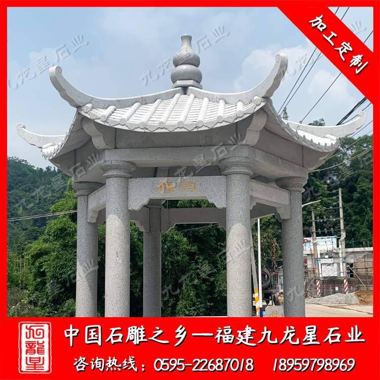 案例名稱:石雕涼亭合同時間:2020.07安裝時間:2020.08地 點:廣東普寧規格:柱子28*28 涼亭外徑330材質:G617數量:1套