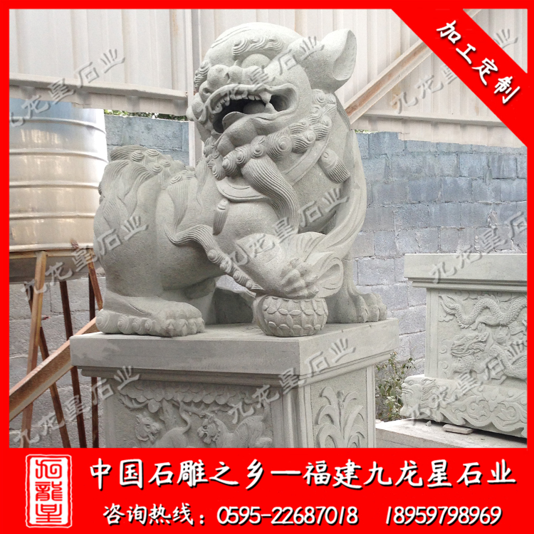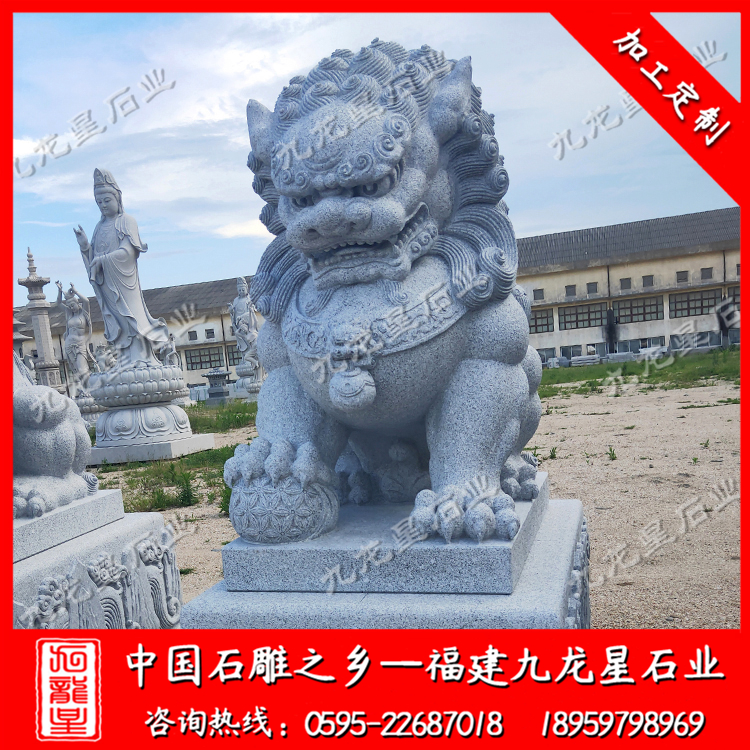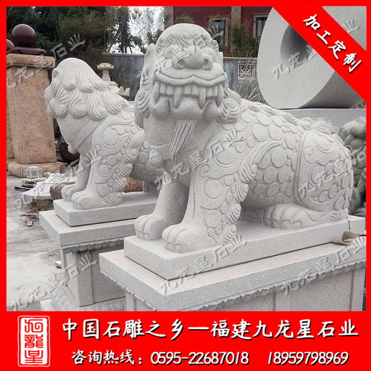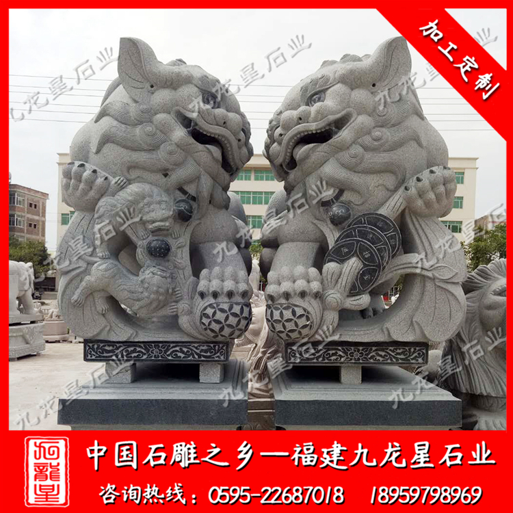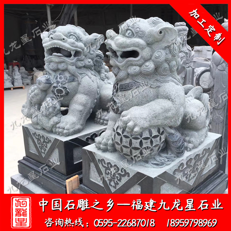 石雕獅子的造型一般尊嚴(yán)而又大氣,是宮中守衛(wèi)門戶確保皇宮安寧的瑞獸,因?yàn)楠{子是獸中 ,它體態(tài)壯碩雄健、威錳無比、氣勢非常。統(tǒng)治者認(rèn)為獅子不但可以避邪,還可帶來祥瑞之氣。北京獅為雌雄一對(duì),獅頭飾鬃髦,頸懸響鈴,肌肉發(fā)達(dá),氣勢雄偉。雌獅前左腳下有一幼獅仰臥作嬉戲狀,雄獅前右腳撫踩一繡球。底座有繁縟精致的卷葉紋。石雕北京獅瑞獸一種,百獸 ,勇不可擋,威震四方,不但可以避邪,且可帶來祥瑞之氣,能解除多種形煞,亦加強(qiáng)官威或屋主之陽氣,如果窗口見到不利之沖克,如沖煞、天斬煞等,可放一對(duì)石獅面向口可化煞,且有生權(quán)之意,適合官職人員擺放,古時(shí)衙門前就是擺放獅子鎮(zhèn)守。