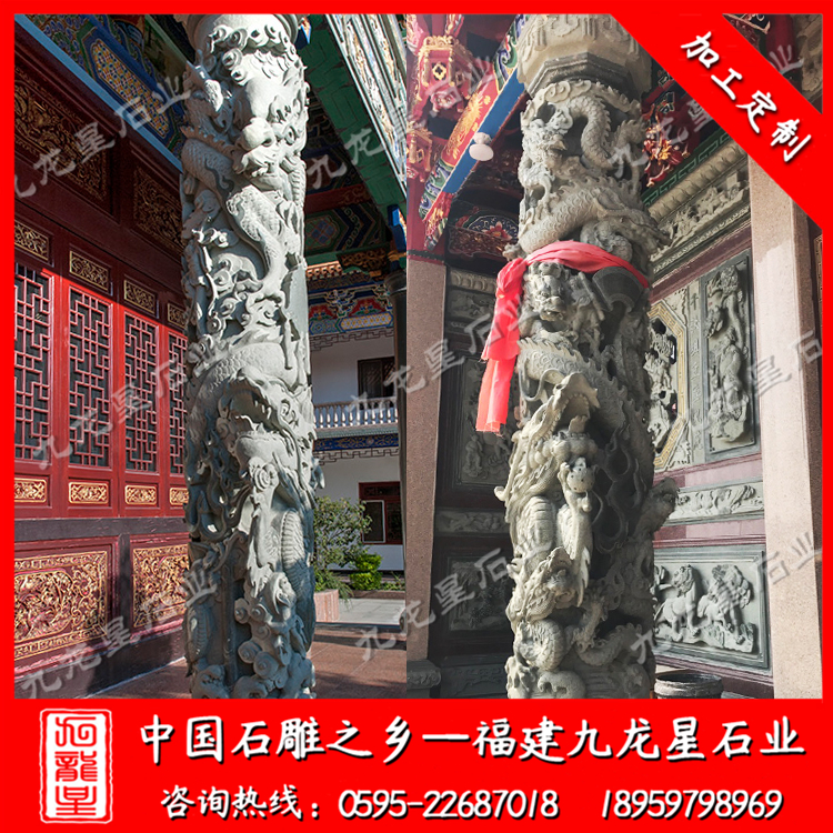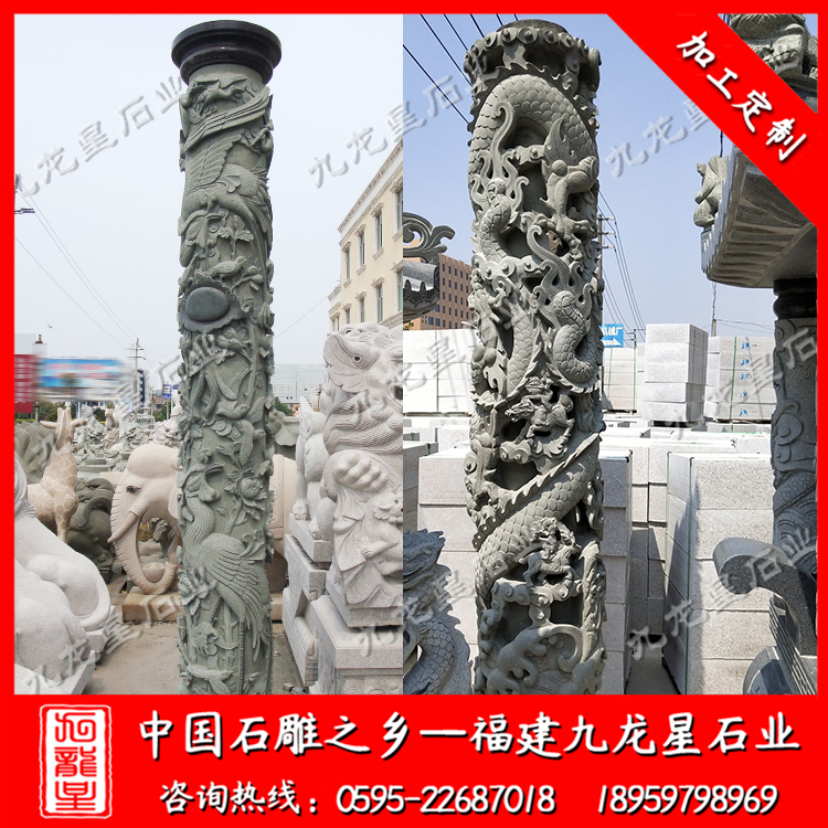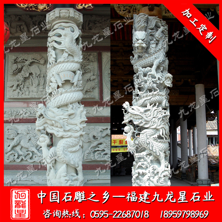石雕龍柱一般采用天青石、漢白玉、草白玉、花崗巖、綠砂巖、紅砂巖、馬頭青等石材,*具代表性的是山東孔廟大成殿里的龍柱,相傳,這深浮雕龍柱因刻的太逼真,堪稱建筑一絶的龍柱,龍柱在孔廟北端的大成殿,立在大成殿前檐,共10根。大成殿前檐的10根柱全為深浮雕,每柱二龍上下對舞,盤繞飛騰,中有龍珠,四雕云霧,柱子上的空閑處還鑲著山石、波濤。十根龍柱,相互對稱,各柱之龍,均具變化,無一雷同,造型之生動,雕刻之剔透,刀法之剛勁,龍姿之神韻,布局之千變萬化,各種元素和諧統一。石雕龍柱絶對是中國石刻藝術中罕見的瑰寶。