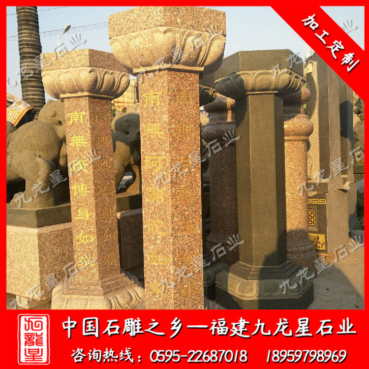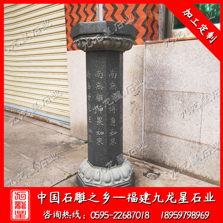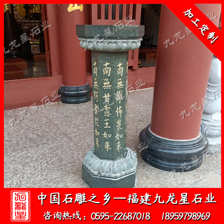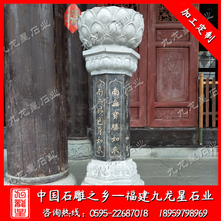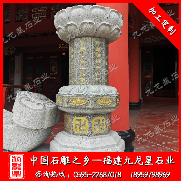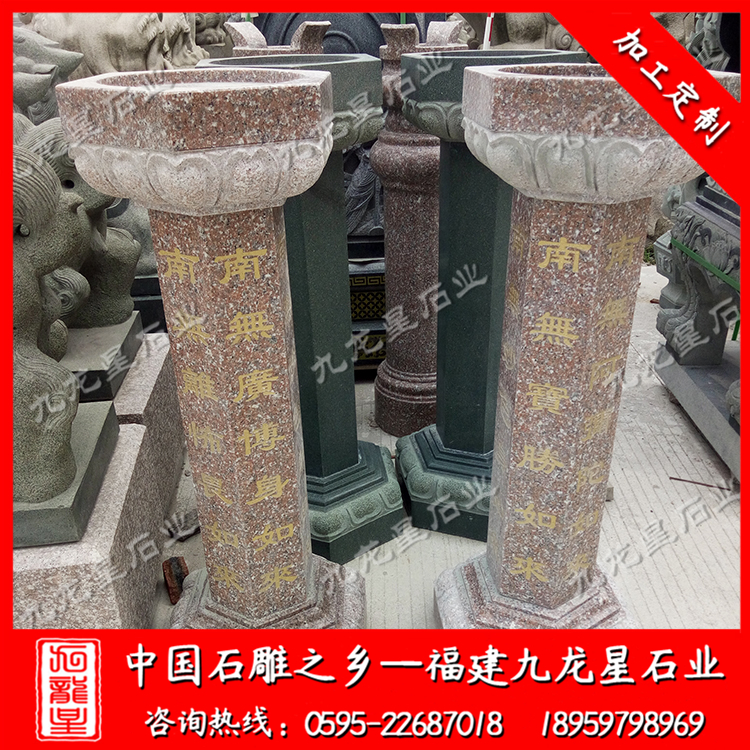在外觀形式上,不同的寺院一般也會定做極具個性化的施食臺。出食臺一般為石柱,一般由柱礎、柱身、承露盤三個部分組成。最常見的施食臺造型為底座是一塊四邊形的板,上面是一個單層的俯蓮臺,蓮花瓣會相對較大,通常這種蓮花瓣會做成雙瓣的,更飽滿許多。柱身部分則雕刻七寶如來大名以及本師釋迦牟尼的法名,一般這些雕刻的文字都會上好金漆。有些寺院需要定制符合寺廟風格的,也只是在這種表現方式上進行一些調整而已。當然有些調整比較明顯的也有,那就是把底座調高,內容更加豐富,比例突破常規造型。也有一些要求比較高的寺院,會將出食臺的八面都雕刻上對應的佛像法相,法相下面是對應的佛像名稱。施食臺的承露盤一般會由三層蓮花瓣疊加而成,呈仰蓮形態,大小直徑與底座相差無幾。