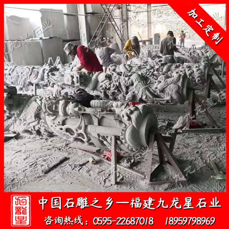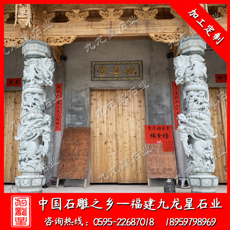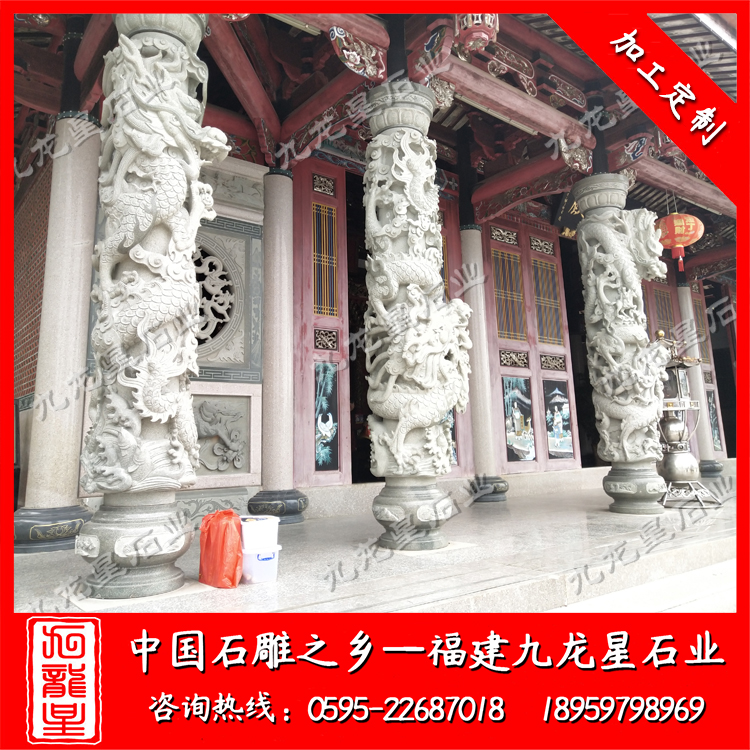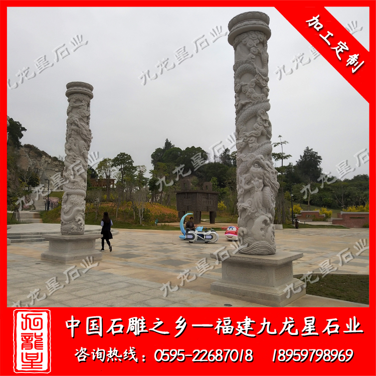 石雕龍柱被稱為石雕圖騰柱,有的地方稱作盤(pán)龍柱或者文化柱等。石雕龍柱以整根石材雕刻而成,一般出現(xiàn)在城市廣場(chǎng),公園和廟宇大殿內(nèi),擺放的位置都比較明顯,尺寸高大醒目,點(diǎn)綴出了一道格外美麗的代表性裝飾。下面由石雕龍柱廠家——福建九龍星石業(yè)發(fā)展有限公司對(duì)石雕龍柱樣式做個(gè)簡(jiǎn)單的介紹。石雕龍柱的擺放講究。在多個(gè)石雕文化柱柱體一字排列時(shí),近視的效果會(huì)給人感覺(jué)石雕文化柱之間的虛空間像一道透明的屏障,即分割開(kāi)公共空間與外部空間,又形成一個(gè)開(kāi)放的大門(mén),透過(guò)它可以清晰低看到后面的其他景觀。半圓弧形狀擺放的布局是文化柱和主雕結(jié)合的方式,兩者之間相呼應(yīng)形成一個(gè)整體的空間領(lǐng)域。