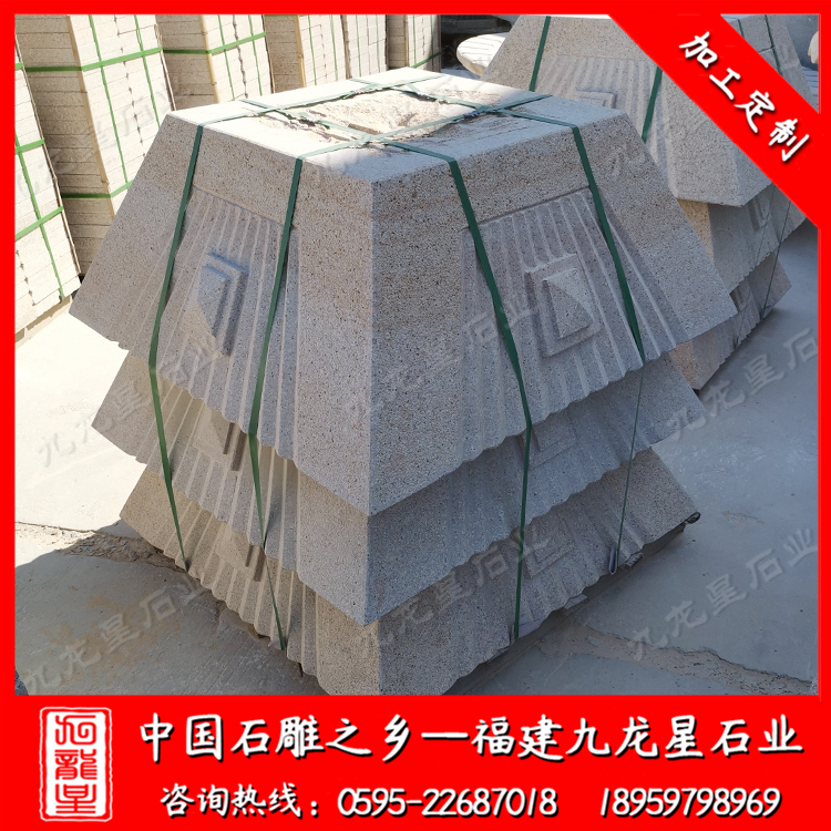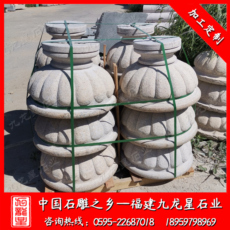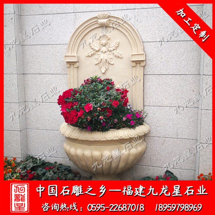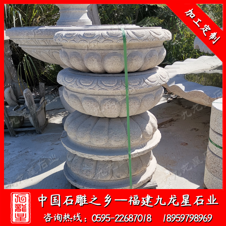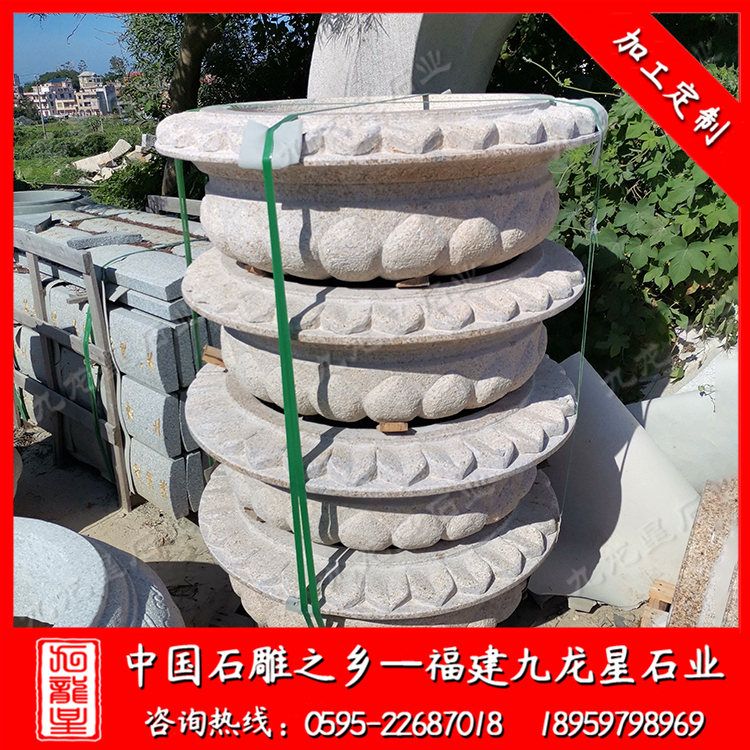 現代景觀花缽在制作過程中常用到的素材都是天然石材,一般為花崗巖和少數大理石、砂巖,其中以花崗巖為常見。常用的花崗巖石材種有黃銹石、黃金麻,這兩種石材的顏色與黃金的顏色接近,有財寶的象征寓意,對于偏愛象形諧音、講究風水的中國人來說,對之很喜歡。而這種顏色又與土地泥巴的顏色相接近,很好打理,因此在建筑景觀中使用頻率很高。常見到的大理石一般為米黃系列大理石,這類大理石由于石材價格昂貴,通常會在一些相對髙檔的小區中使用,以埃及米黃、西班牙米黃大理石花缽常見。當然了,有時候為了使得花缽與整體環境能夠搭配得更美觀,有時也會用一些其他石材的花缽,比如漢白玉花缽、芝麻白花缽、楓葉紅花缽等等。