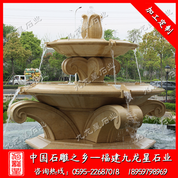 石雕噴泉是將噴泉藝術和雕塑藝術相結合的一種景觀設計,現在石雕噴泉較多的出現在我們生活的環境中,公園里、廣場上、公寓住宅園區、酒店賓館、單位廠房等等、我們生活的環境中。單從雕塑藝術方面來看, 大理石噴泉無論從石材的加工還是款式設計, 都非常藝術特質。石雕噴泉的款式可由簡到繁、由簡約到奢華、由室內小型到室外大規格噴泉設計。種類繁多, 設計不單一, 不會在眾多的景觀中給人們帶來審美疲勞。簡約式的大理石噴泉設計主體有分層次的流水水缽構成,沒有其他雕塑的陪襯和點綴。這種款式簡單大方,流水效果主要取決水盆款式的設計, 不同水盆邊緣的開槽或是弧度都會直接影響最終的流水成型效果。
