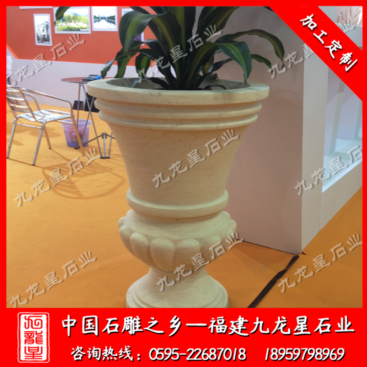 一般還可在花缽上雕刻動(dòng)物、人物形成動(dòng)物花缽、人物花缽。石頭花盆由材質(zhì)可分花崗巖花缽(黃銹石花缽、白麻花缽、芝麻白花缽、芝麻黑花缽、黃金麻花缽)、大理石花缽(埃及米黃花缽)、砂巖花缽、銅雕花缽和玻璃鋼花缽。選擇花缽時(shí),還要注意大小,高矮要合適。花缽過(guò)大,就像瘦子穿大衣服,影響美觀,而且花缽大而植株小,植株吸水能力相對(duì)較弱。澆水后,盆土長(zhǎng)時(shí)間保持濕潤(rùn),花木呼吸困難,易導(dǎo)致爛根。花盆過(guò)小,顯得頭重腳輕,而且影響根部發(fā)育。