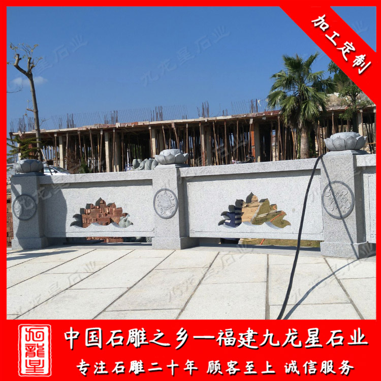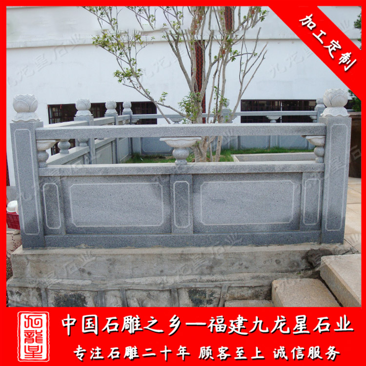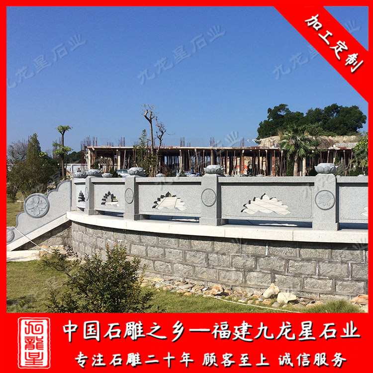 現(xiàn)在石欄桿一般安裝在橋梁的兩側(cè)、河道的邊緣或者仿古寺廟回廊的周邊以及五星紅旗的旗臺(tái)上,除了可以起到美觀映襯的作用,還可以加強(qiáng)安全防護(hù),所以得到了廣泛的采用。隨著花崗巖石欄越來(lái)越多的應(yīng)用,石欄廠家也是越來(lái)越多。九龍星就是其中一家,九龍星有用自己的石雕加工廠,是名副其實(shí)的廠家供應(yīng)花崗巖石欄桿等。廣大客戶可以來(lái)實(shí)地考察。