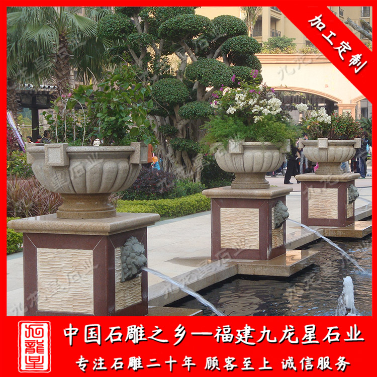 歐式石雕花盆具有可移動性強、可組合、保存時間長久、造型美觀高雅等特點,因而一經推出,就廣受大眾的喜愛。隨著花缽的大量應用,花缽在造型、用材、植物搭配上也得到了充分的發展,材質上有黃銹石花缽、黃金麻花缽、大理石花缽、芝麻白花缽等等。造型上有蓮花式花缽、U型花缽、方形花缽等等。石雕花缽外表面的紋理也在不斷的豐富。