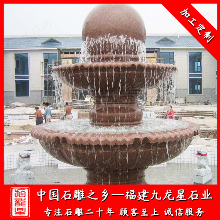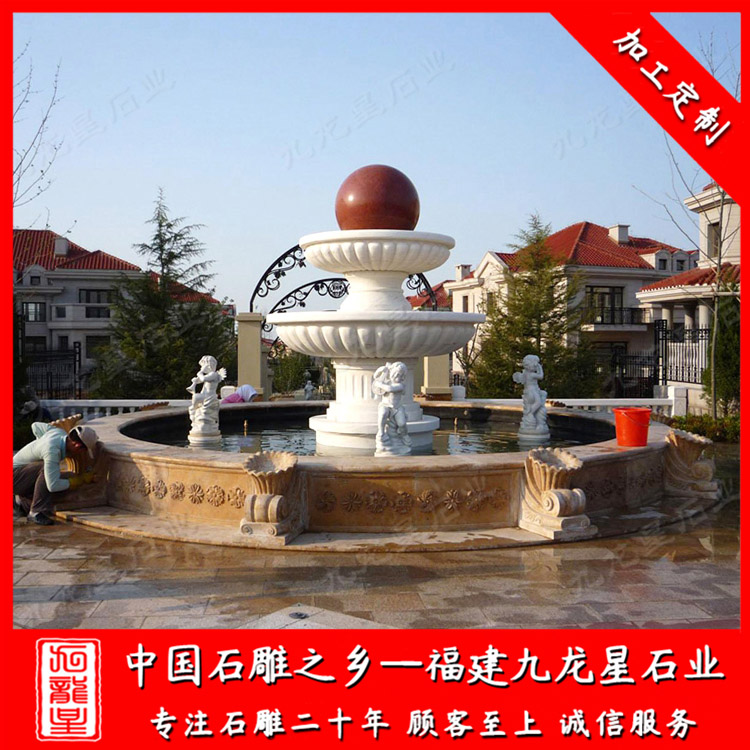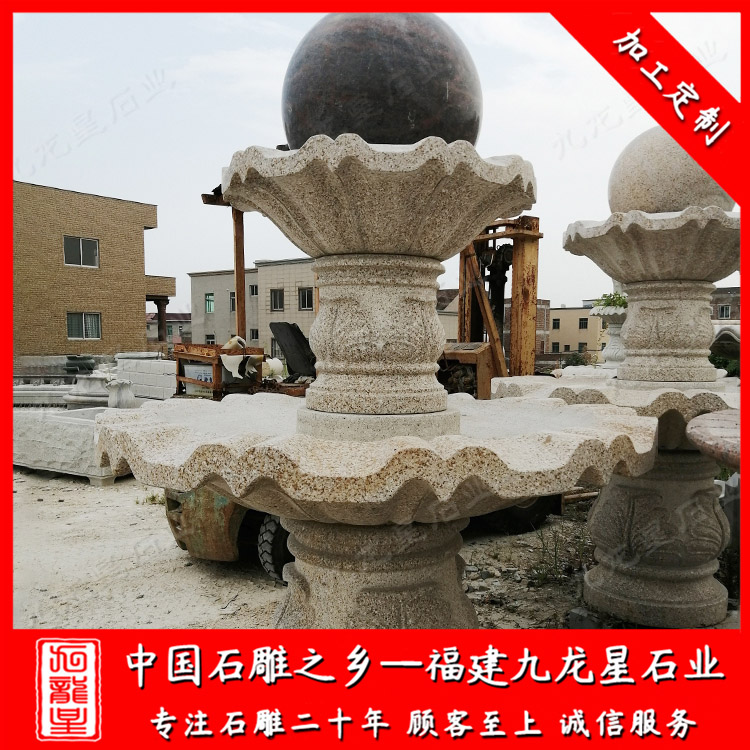石雕風水球噴泉雕塑是在風水球的根底上分離石雕噴泉設計元素的一種新型的園林流水擺件,這個風水球噴泉頂部采用轉動的風水球,球的下面主體采用了石雕噴泉分層次的空間構造的流水水缽,中間有不同雕琢外型和花紋的柱子,打造一個石雕構造的建筑。其形式和設計款式要比單石雕風水球豐富的多。