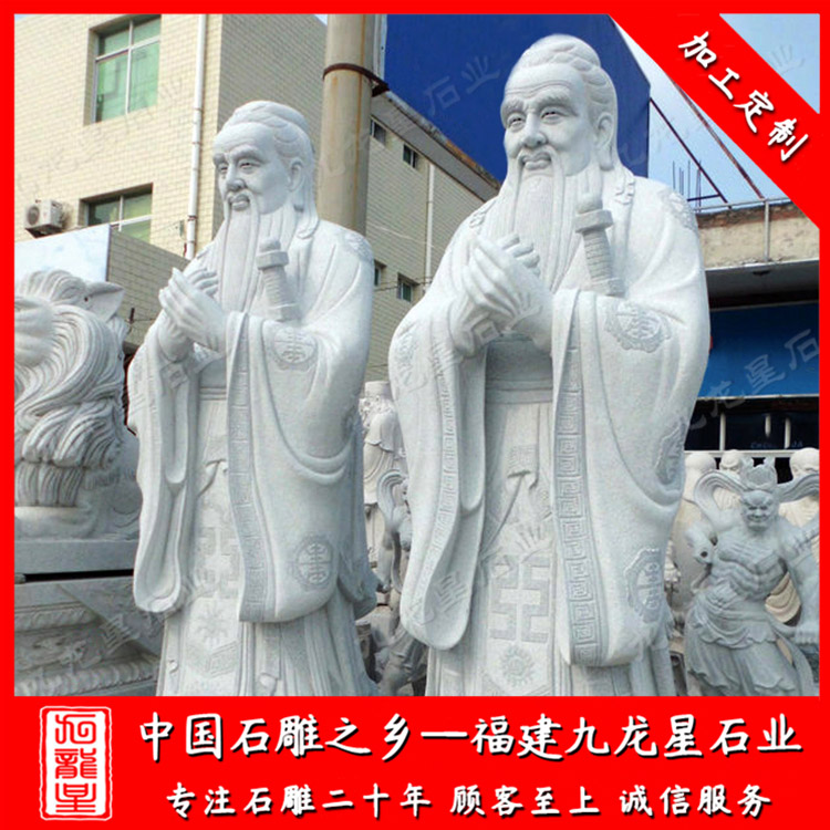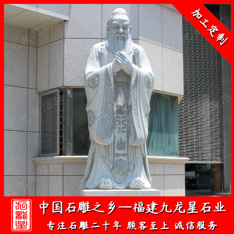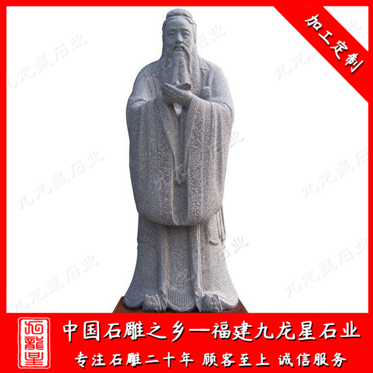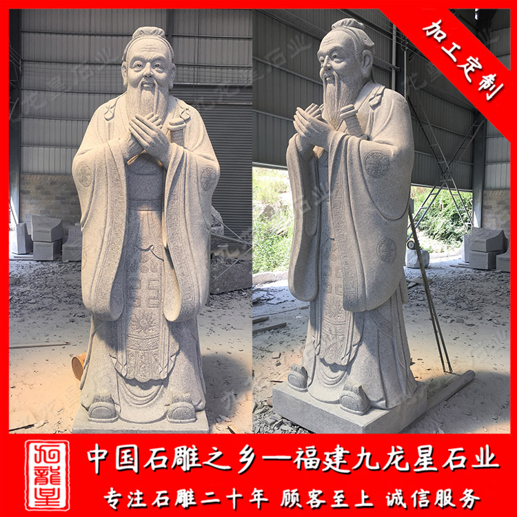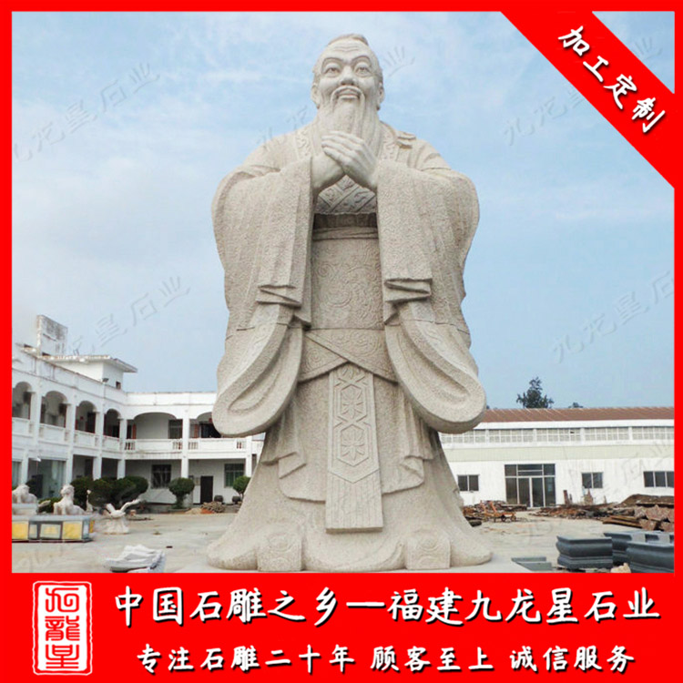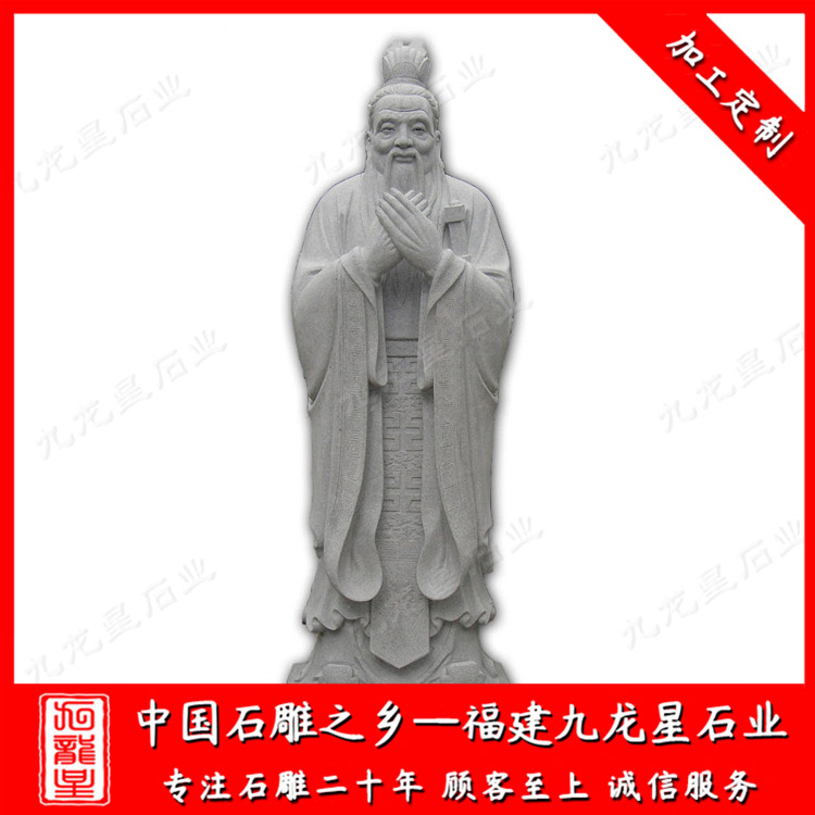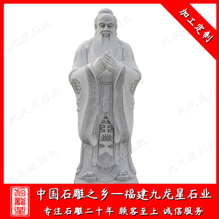 校園石雕孔子雕塑一般是石材制作成的,也叫孔子石雕像。常用的石材有花崗巖,漢白玉,青石等。孔子制作成石雕像有眾多的版本,但是大部分的石雕孔子雕像都有一個(gè)共同點(diǎn),就是石雕孔子的雙手交叉放于胸前,這個(gè)特點(diǎn)也成了孔子雕像所必須有的基本造型。石雕孔子像一般擺放在校園、學(xué)府、廣場(chǎng)、孔廟等地方。孔子是儒家學(xué)派的創(chuàng)始人,被后世尊稱為“孔圣人”,更被清康熙帝尊稱為“萬(wàn)世師表”,因而被世人所景仰。