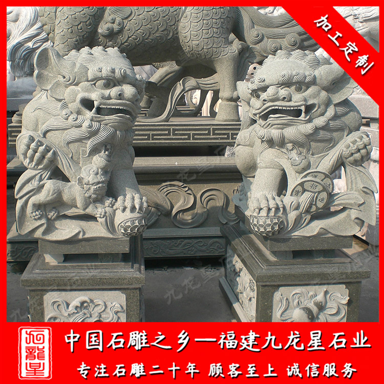 一般公獅子擺放左邊,同時爪下玩彩球,表示張燈結彩、盛世太平,若球上刻有銅幣,則還有求財之意;母獅子擺放在右邊,爪下撫摸小獅子,以示家庭和睦、子孫繁盛。