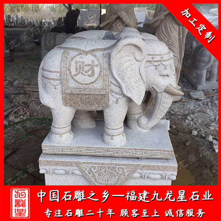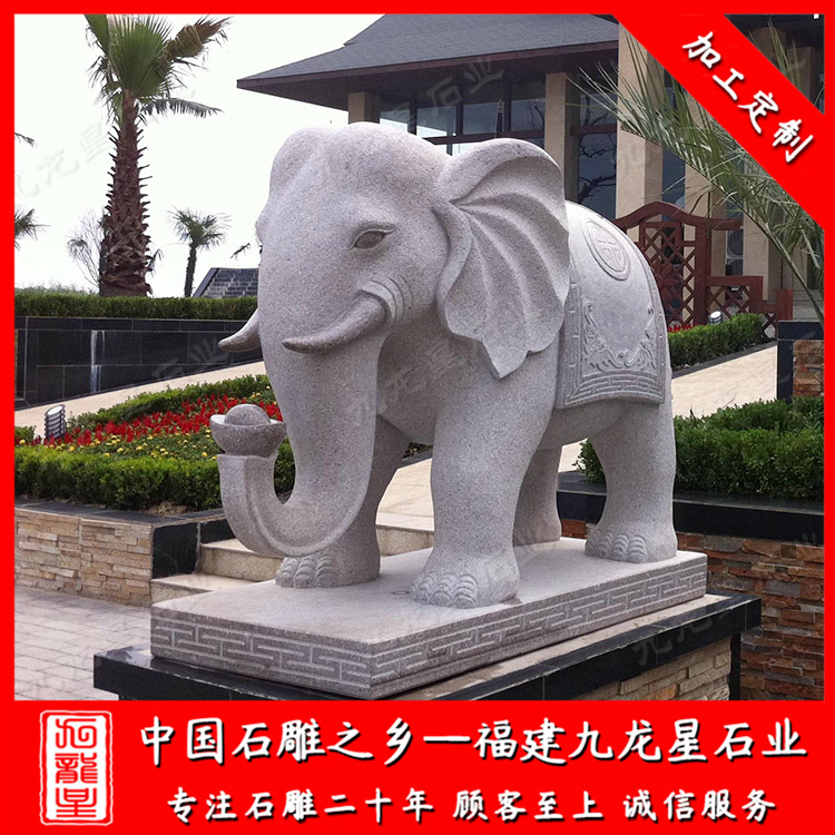 石雕大象常見于大門口處擺放,或?yàn)?.5米高、或?yàn)?米高等不同尺寸。如山的體型給人一種安穩(wěn)可靠之感。另外,石雕大象有肥厚的耳朵、圓鼓的肚子、四肢圓柱,這是有福相、福象的象征。體態(tài)溫順的石雕大象常以一對、群居的形式出現(xiàn),喜自然、和平和諧,是瑞獸的象征。傳統(tǒng)文化里,石雕大象還有“聚財(cái)納福”之寓意。大象喜水、善吸水,“水”為“財(cái)”。相傳大象是觀音菩薩的坐騎、隨從,擺放一對石雕大象也有可以保護(hù)人們避免災(zāi)難。