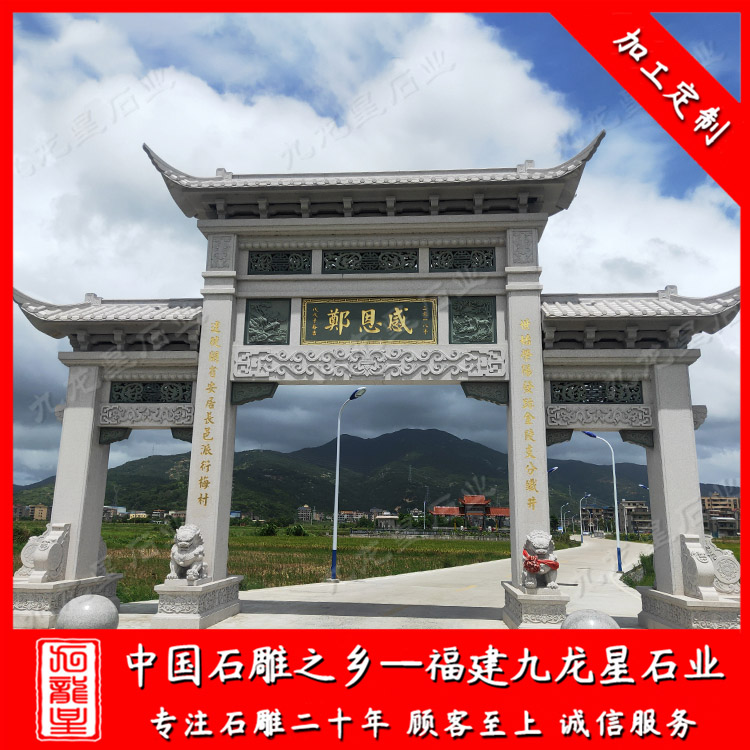 九龍星石業位于福建惠安,常年加工批發石牌坊,款式多樣,有村牌坊、景區石牌坊、寺廟石雕牌坊、宗祠牌坊等等,歡迎咨詢我們,我們會發您一些適合您的石牌坊圖片,并為您做出報價。