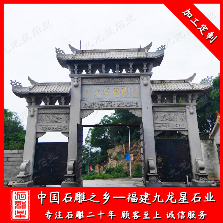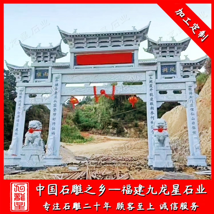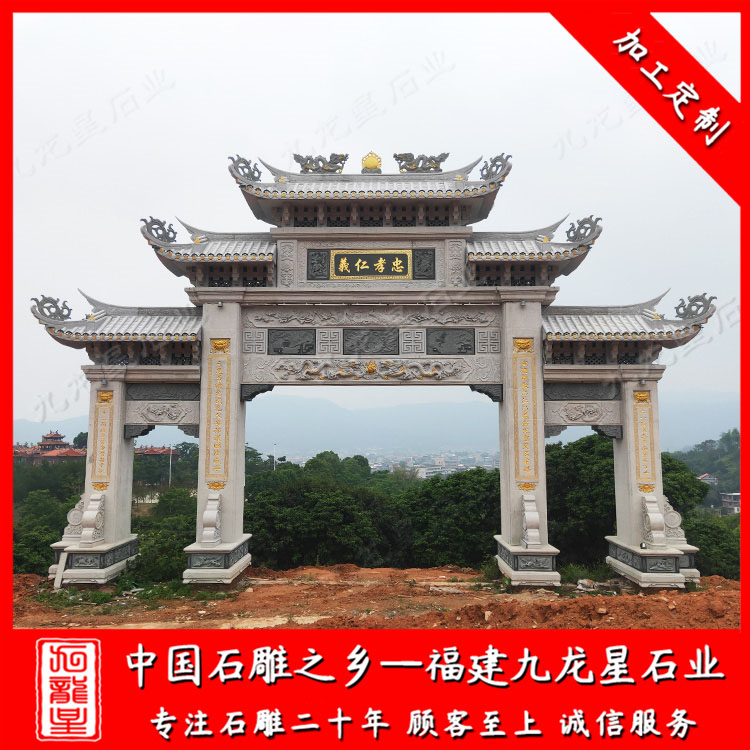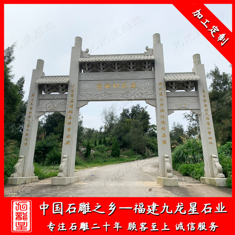惠安石雕牌坊廠家雕刻的寺廟石雕山門牌坊、三門石牌坊采用花崗巖、青石、大理石等材質雕刻加工制作,高度有8米、10米、11米、12米、13米等等,寺廟石雕山門牌坊直徑有10米、11米、12米、13米、15米不等,按照寺廟入口大門的實際情況而定做。九龍星石業常年加工批發石牌坊,款式多樣、工期快,歡迎廣大客戶前來定制。