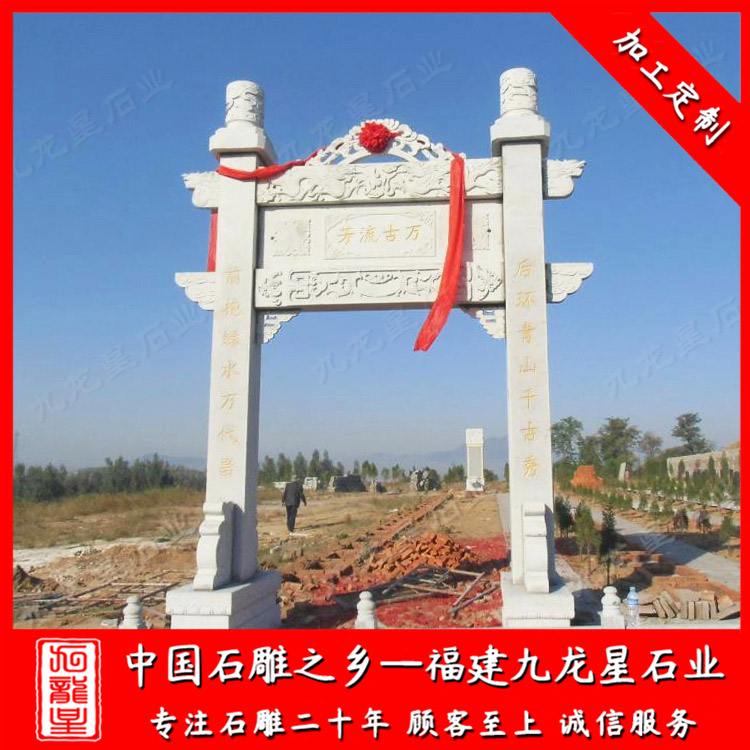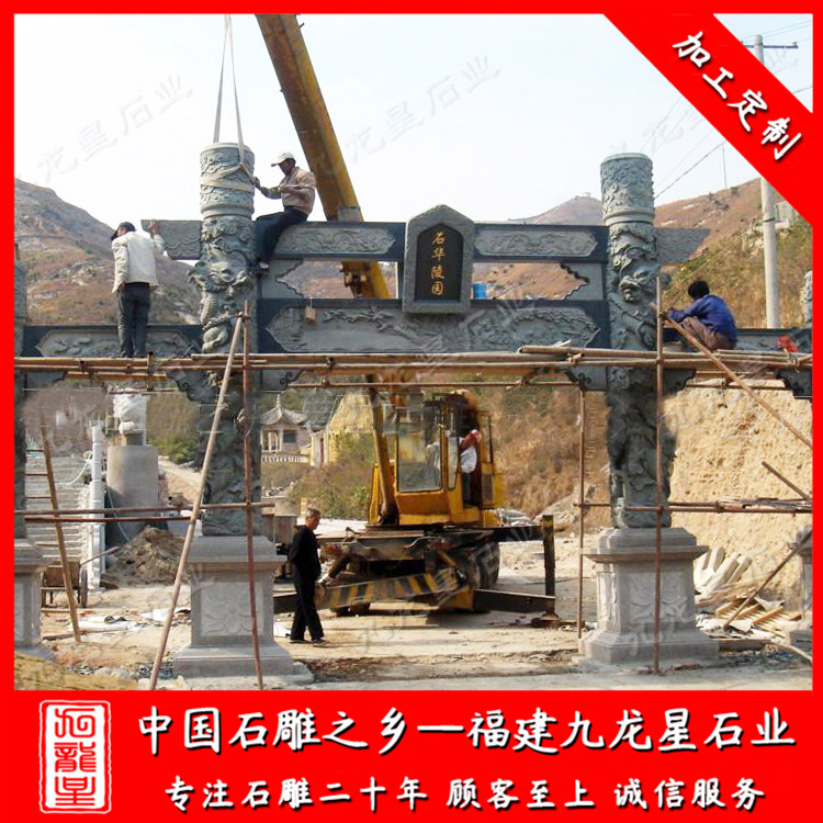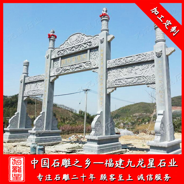 九龍星石業從事石雕行業二十多年,常年加工批發石牌坊、有景區石雕牌坊、寺廟石雕牌坊、公墓石牌坊、墓園石牌坊、村牌坊等等,歡迎咨詢我們定做。