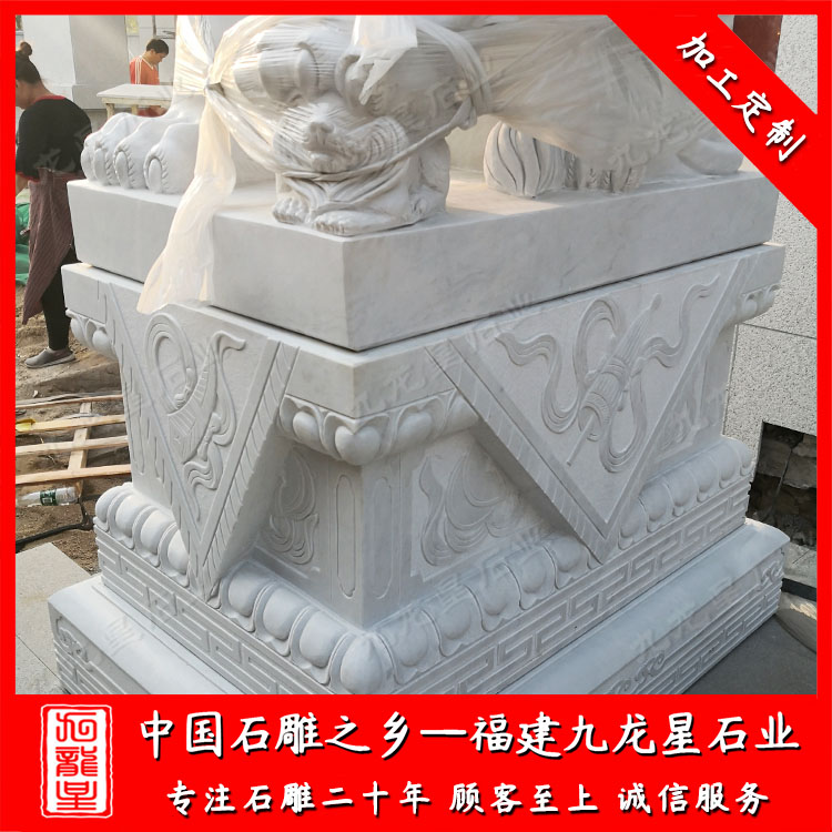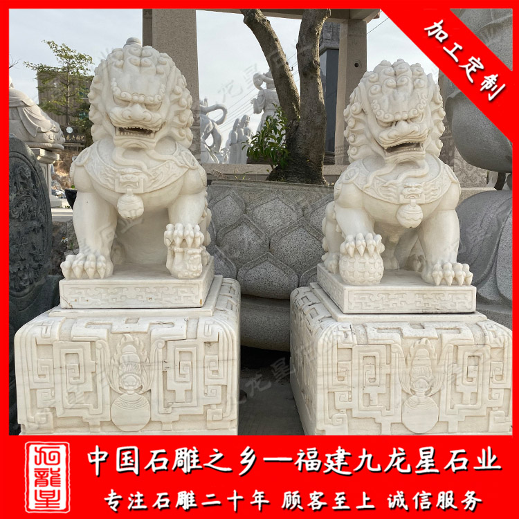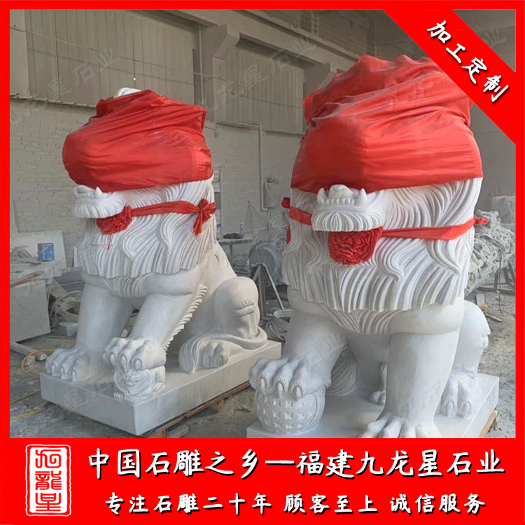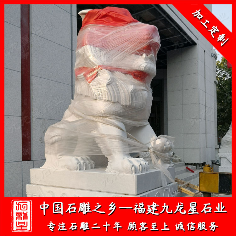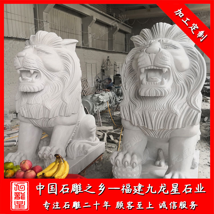 因為漢白玉表面看上去潔白,采用漢白玉雕刻的獅子看上去簡潔大氣、華麗壯觀。漢白玉獅子安裝在銀行門口、別墅門口、酒店門口等地方。