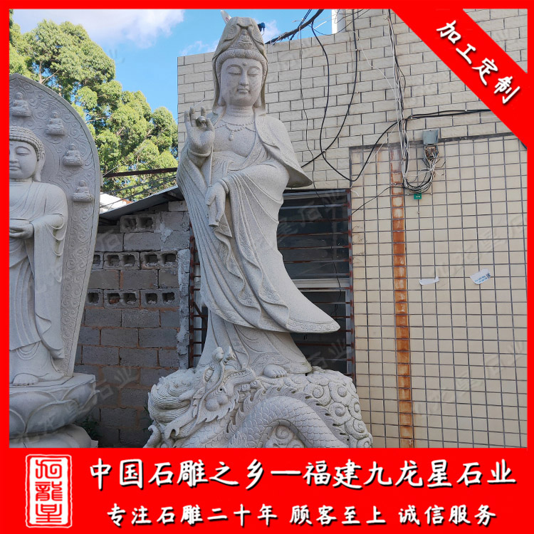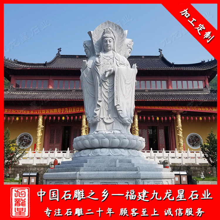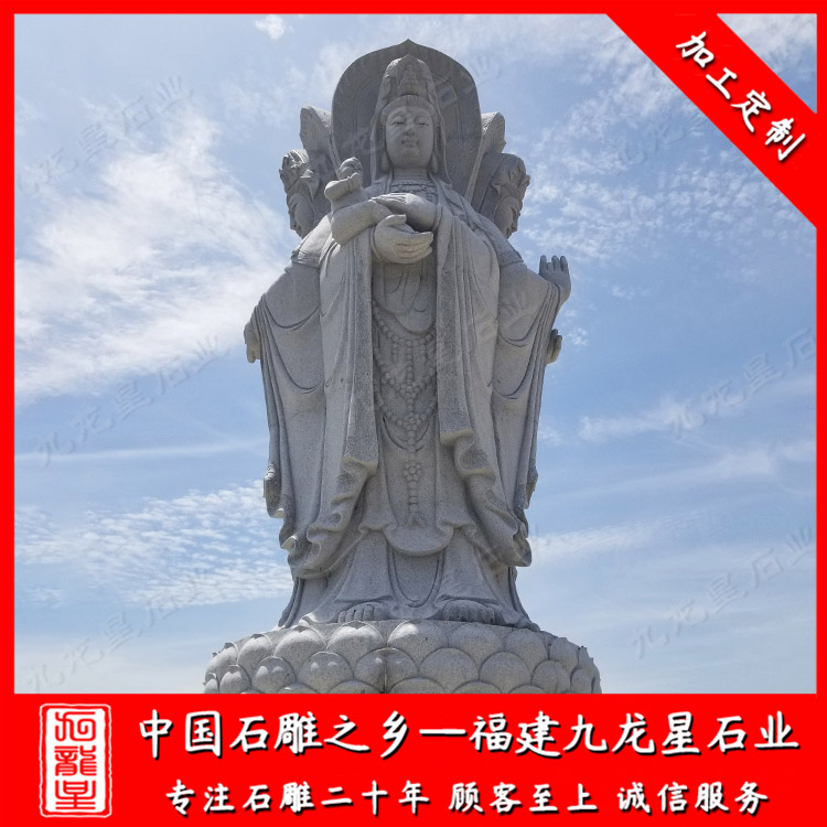 在傳說中大型石雕觀音菩薩雕像的形象是以慈祥、端莊、仁愛,有著千般面相。在一些寺廟、民間佛堂、風景區、鄉村都有供奉的觀音石像,在制作材質上也是有比較多的選擇的,像漢白玉、青石、芝麻白、本山石等等都是選擇比較多的。