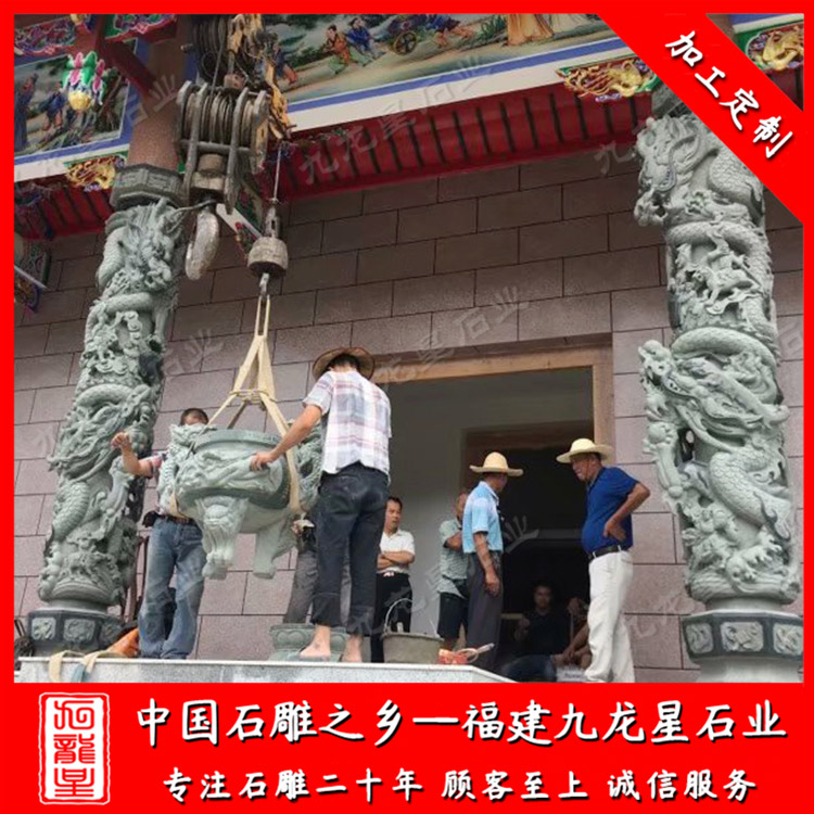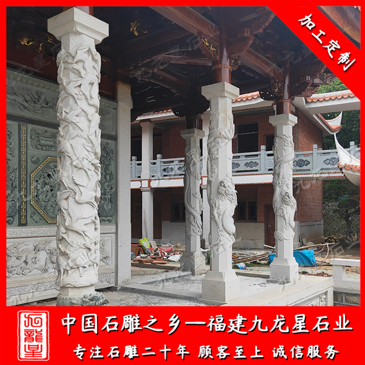 另外,還有一種是石柱子上雕刻龍鳳。從古到今,龍鳳在我國都有著美好的寓意。龍威嚴神秘、鳳高雅美善;龍讓人心生敬畏,鳳使人剛到溫馨。石雕柱子雕刻龍鳳也有龍鳳呈祥之意,蘊含和氣。雕刻石雕龍柱的時候石匠們還會搭配水紋、云紋、蓮花、瑞獸等圖案紋飾,如果您想要雕刻石雕龍柱(寺廟石雕龍柱、宗祠石雕龍柱、祠堂石雕龍柱、廣場石雕龍柱)、加工定做石雕龍柱可以找石雕廠家進行款式的設計再雕刻加工定做。