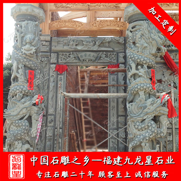 祠堂門口石柱或者是祠堂廳內的石柱常見的有石雕圓柱、石雕方柱,但更為常見的是石雕龍柱。雕刻安裝祠堂石雕龍柱在祠堂門口、祠堂廳內可以使得整個祠堂更為的古樸莊重。