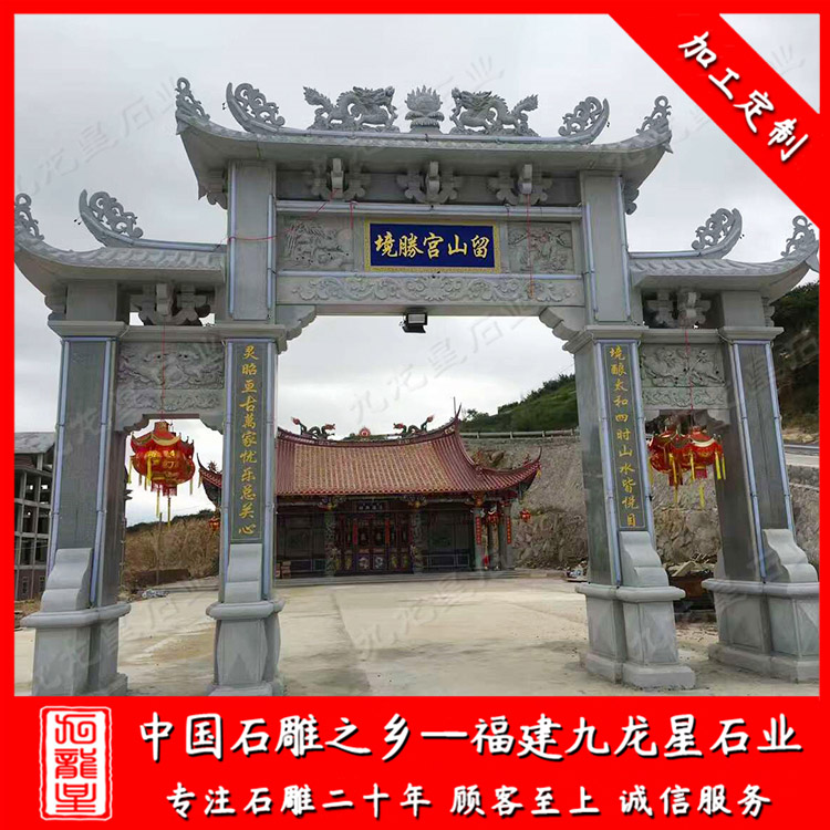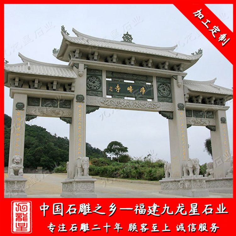 三門三樓石雕牌坊在村口、新農(nóng)村、景區(qū)入口、寺院入口等地方很是常見。三門三樓石雕牌坊主要是通過浮雕、鏤空雕刻、圓雕等形式加工制作而成。