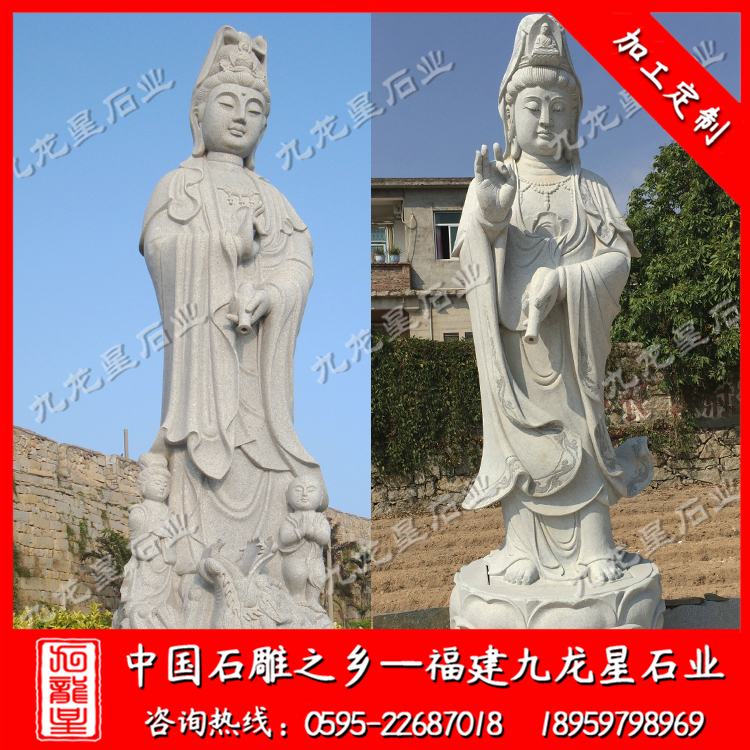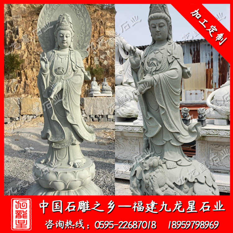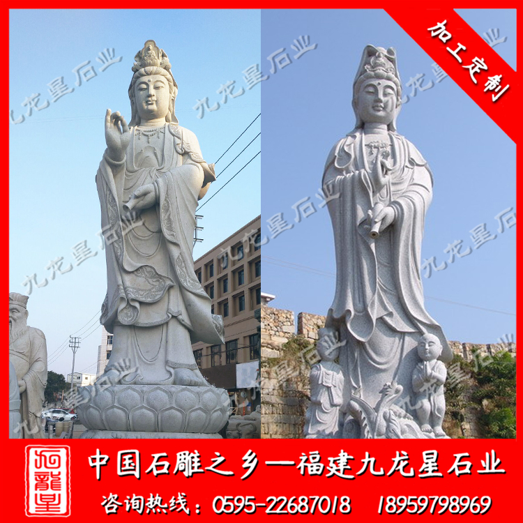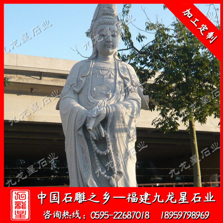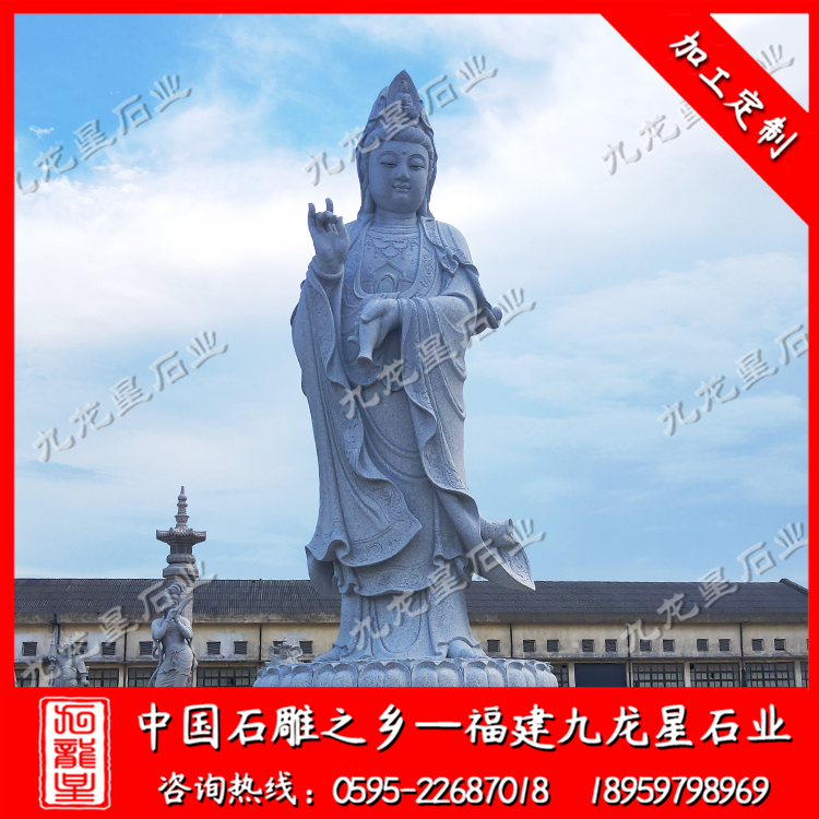 石雕觀音(石頭雕刻觀音菩薩像 石雕觀音定做廠家)——九龍星石業石雕觀音象征著智慧、仁慈、和平,并可以在家中擺放。此外,隨著人民對佛像的認知度越來越高,更多的人供奉觀音菩薩像。石頭雕刻觀音菩薩像的加工,首先要先確定石雕觀音像造型,畢竟現在石頭雕刻觀音菩薩像的設計多樣,風格也都各有不同,在設計上都需要先確定基本的造型。石雕觀音像分類多,惠安石雕觀音像廠家設計也都各有不同,其中包括了過海觀音、楊柳觀音、白衣觀音、千手觀音等等,雕刻設計樣式不同,在雕刻上也都會有不同要求。需要先有一個整體的設計,確定觀音石雕像樣式等,確保雕刻的順利進行,塑造精致觀音作品。