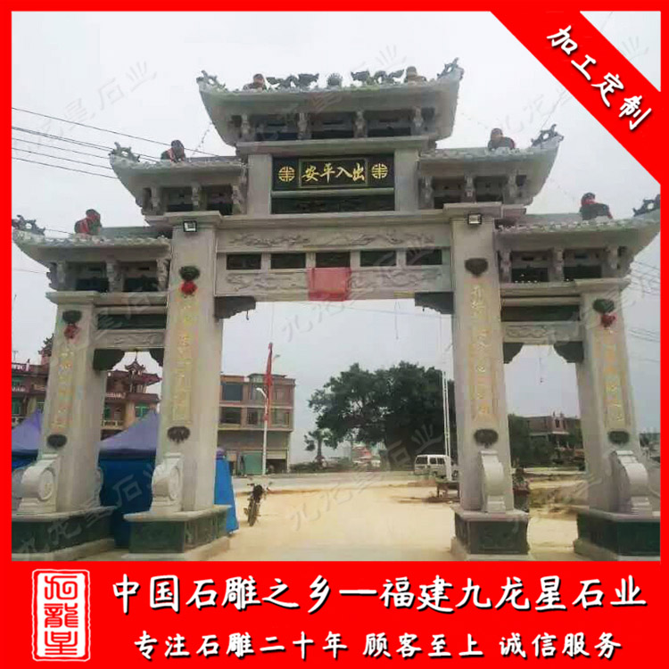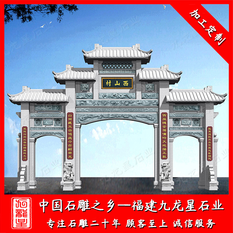 村莊入口仿古石牌坊可以說是當前振興、宣傳新農村的一個標志性建筑物。村莊入口仿古石牌坊圖片中我們不難看出以三門石雕牌樓、仿古石牌坊的款式居多。