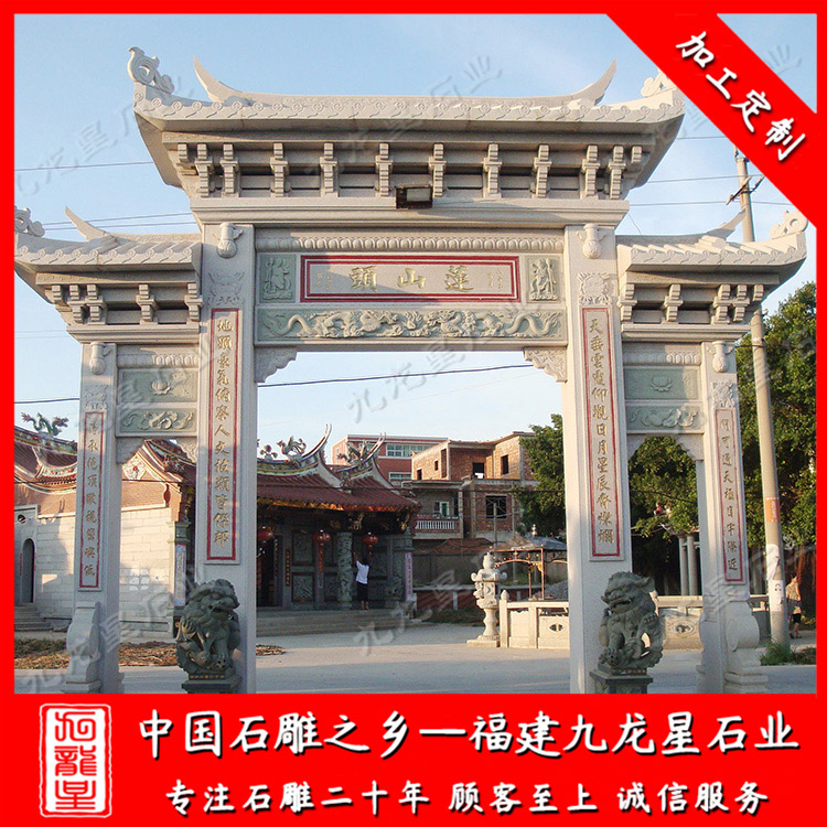 生活中的石雕牌坊可以說是集建筑學、石雕學、藝術學、美學、工藝學、書法等于一體的綜合性建筑。在而今的新農村建設中,很多村莊會考慮在村口、村莊入口、進口的地方建造一座石雕農村牌坊。