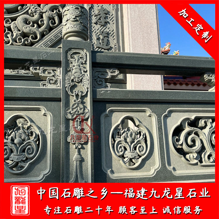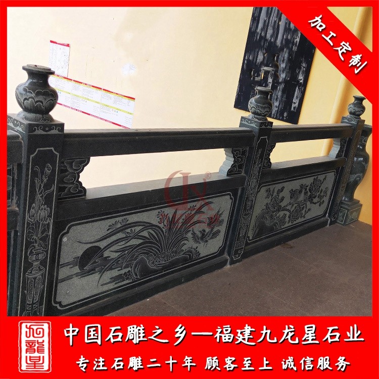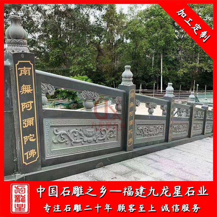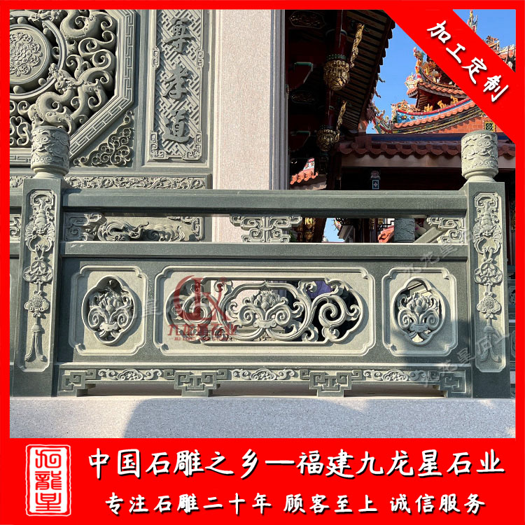寺廟石雕石欄桿很多采用的是青石、芝麻黑、芝麻白、芝麻灰、漢白玉加工制作而成。