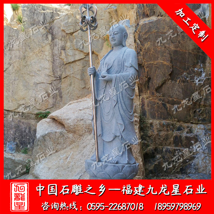 石雕地藏菩薩,或稱石雕地藏王菩薩,。據《地藏十輪經》講,因其“安忍不動如大地,靜慮深密如秘藏”,故名為地藏。為佛教四大菩薩之一,與觀音、文殊、普賢一起,深受世人敬仰。亦是佛教八大菩薩之一。其道場在安徽省池州市九華山,與浙江普陀山、山西五臺山、四川峨眉山并稱為中國佛教四大名山。石雕地藏王有:“地獄未空,誓不成佛!”“我不入地獄,誰入地獄!”之豪言壯語,被尊稱為大愿地藏王菩薩.石雕地藏菩薩,或稱石雕地藏王菩薩,。據《地藏十輪經》講,因其“安忍不動如大地,靜慮深密如秘藏”,故名為地藏。為佛教四大菩薩之一,與觀音、文殊、普賢一起,深受世人敬仰。亦是佛教八大菩薩之一。其道場在安徽省池州市九華山,與浙江普陀山、山西五臺山、四川峨眉山并稱為中國佛教四大名山。石雕地藏王有:“地獄未空,誓不成佛!”“我不入地獄,誰入地獄!”之豪言壯語,被尊稱為大愿地藏王菩薩.